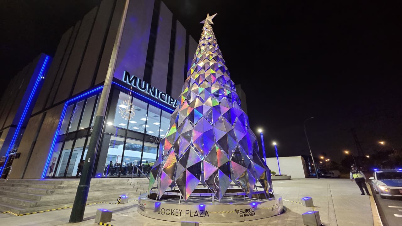 Un árbol navideño de prismas, que no necesita de luces internas para brillar, sino que se vale de la iluminación del entorno, luce imponente junto al Palacio Municipal de Santiago de Surco, en el cruce de la avenida Tomás Marsano y la calle Loma de los Amarilis.